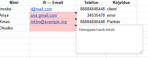 Meiliaadressi valideerimine kontaktide lehel – iga kord, kui kasutaja sisestab kontaktide lehe B-veergu meiliaadressi, kontrollib skript selle õigsust.