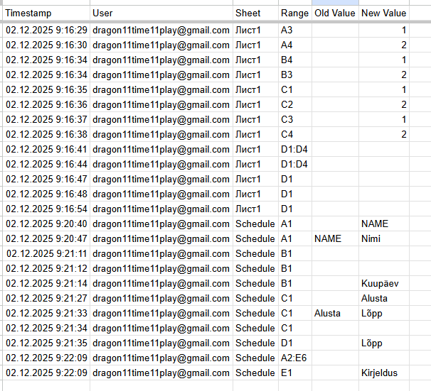 logSheet.appendRow(['Timestamp', 'User', 'Sheet', 'Range', 'Old Value', 'New Value']);